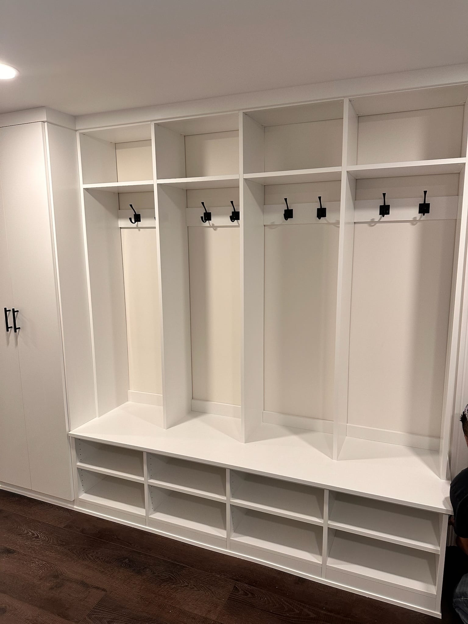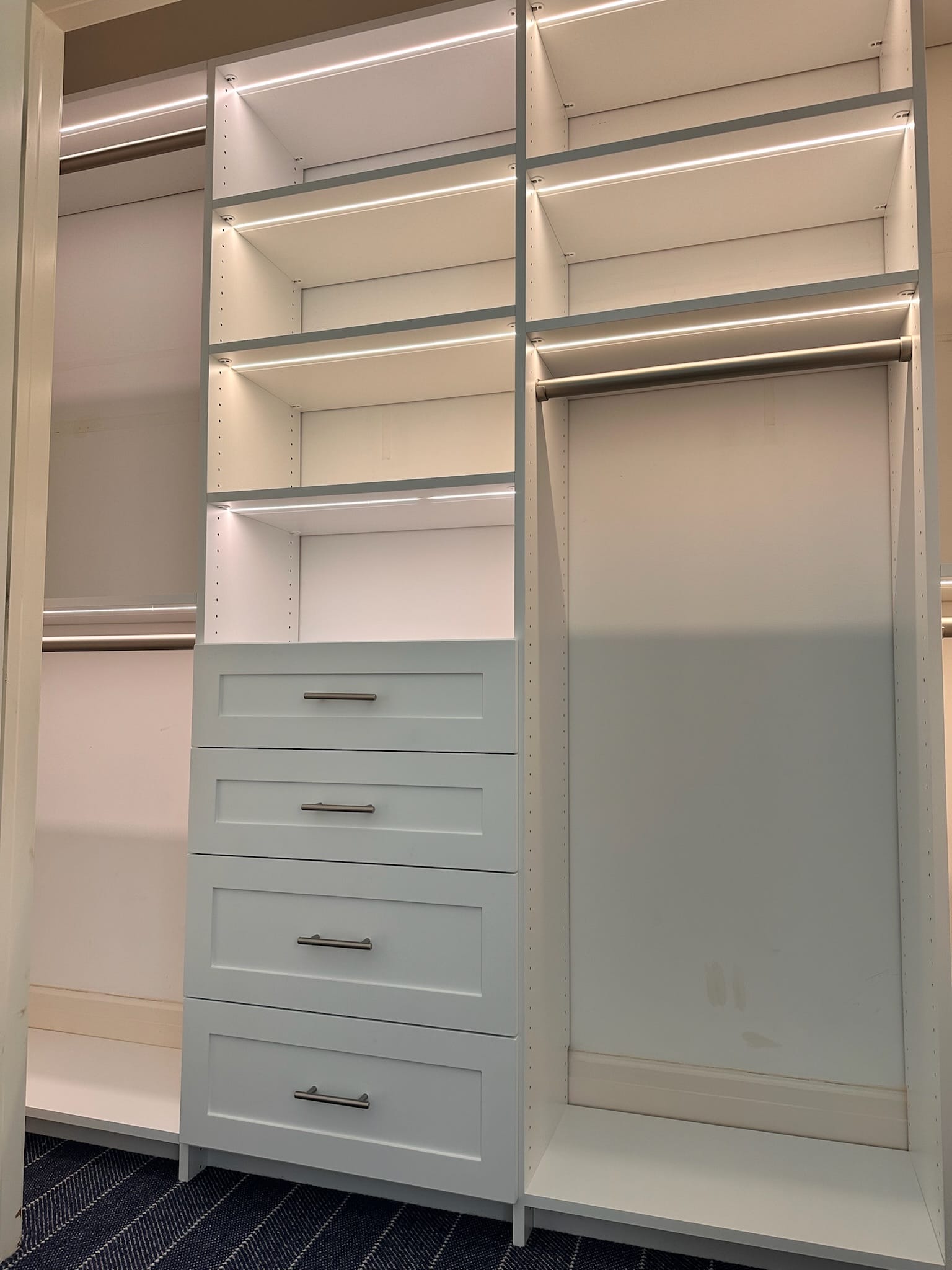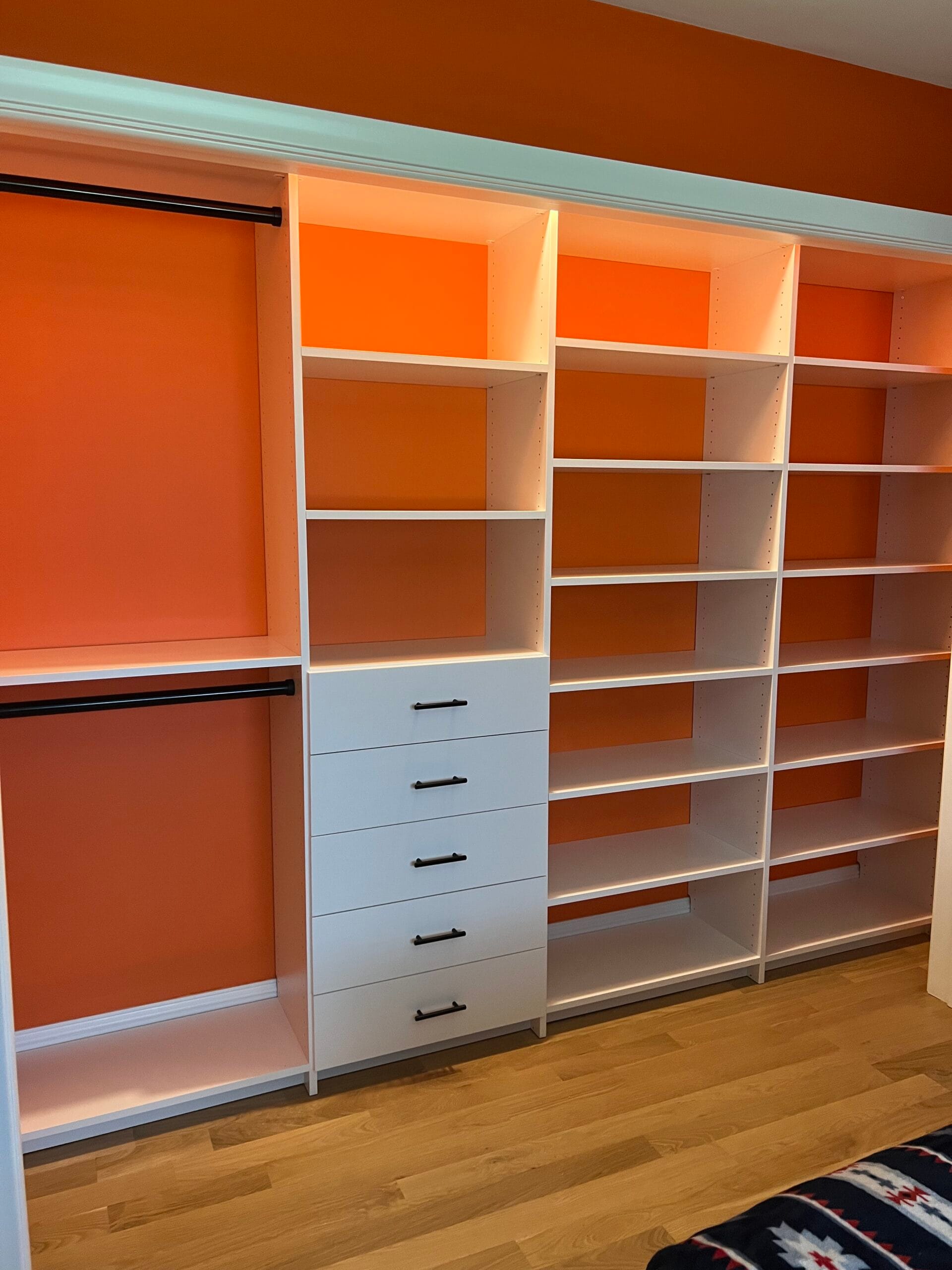 Our custom reach-in designs include adjustable shelving, hanging zones, shoe storage, cubbies, and built-in drawers that make the most of every inch. Whether the closet is in a bedroom, hallway, entryway, or mudroom, we tailor each layout to the needs of your home and family.